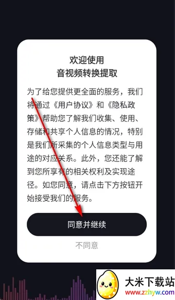 1、打开音视频转换提取app,点击同意隐私政策