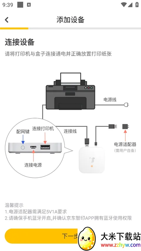 注意:确保打印机已连接电源并开启,将京东智印盒子与打印机按照说明书的指导连接起来。