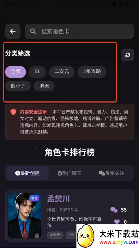 5、点击【更多】进入,可以根据角色标签进行筛选;