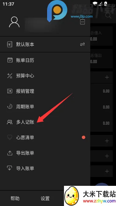 2、打开侧拉菜单点击多人记账