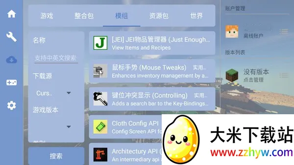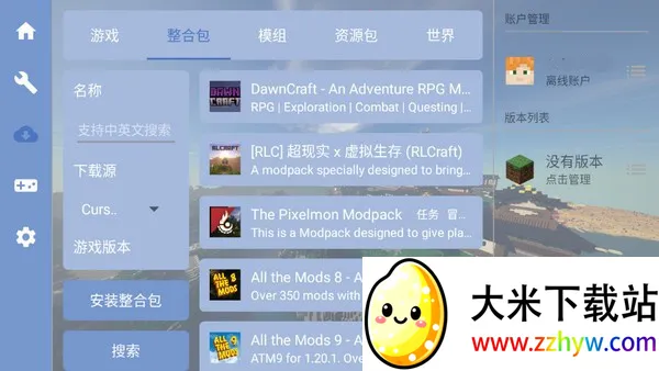 1、在启动器中点击整合包栏目可以看到详细的整合包资源;选择模组可以任意下载模组,这里支持中文英文搜索,可以按下载源,游戏版本,类型等等进行挑选