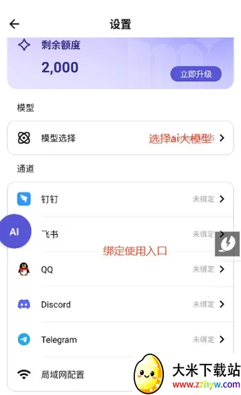 3、进入到配置设置界面中选择ai大模型,然后绑定入口应用