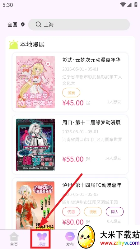 2、浏览列表或搜索,选择目标漫展进入详情页。