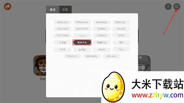 2、点击右上角的齿轮,可以切换语言,把游戏设置成简体中文