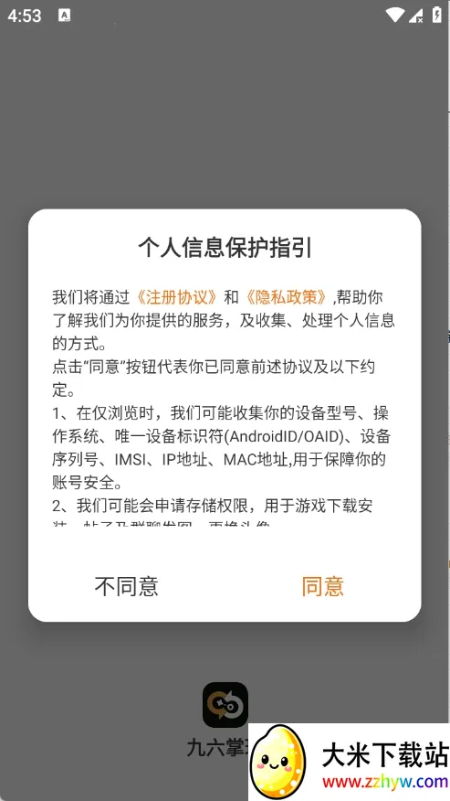 1、用户在本站下载九六掌玩app,点击同意。