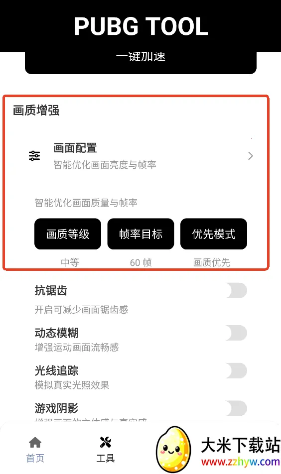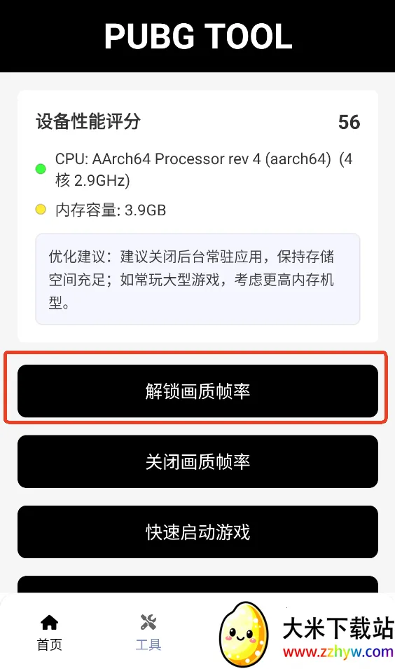 1、在本站下载好软件后直接打开,选择首页的【解锁画质帧率】。