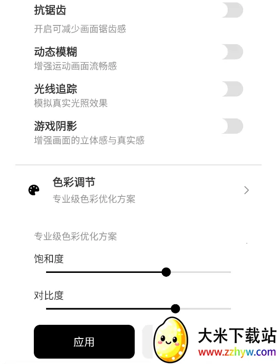 4、继续下滑能设置一些画面的细节表现,让画面更加真实。设置完成后选择应用。