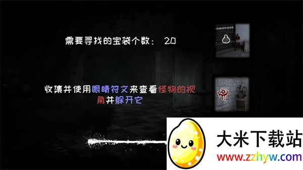 之后游戏页面会出现一段对话,反正你先别管他,页面会提示要求,比如要收集20个钱袋,收集并使用眼睛符文来查看怪物的视觉并躲避他。