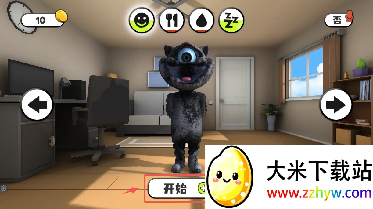 1、首先打开软件会看到一只怪猫,留意它上方的笑脸、水滴等状态图标,别忘了左上角有金币数量,点击怪猫面前的“开始”按钮就正式进入。