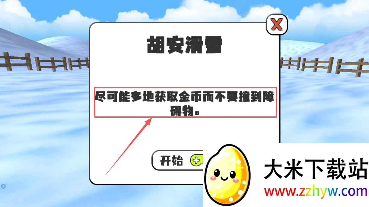 3、进入具体游戏比如胡安滑雪后,先读一下玩法提示,目标是多拿金币别撞障碍,然后点击底部的开始按钮,游戏就正式开始了。